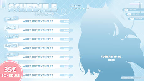1 Schedule : 35€. ⭑When the commission is done, if you want to change the colors, to match with an other Fan art of your model (Just color and Fan art, not changement of all the Schedule) ! I take 15-20€ for all the new changement color.